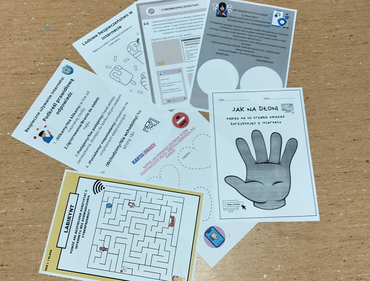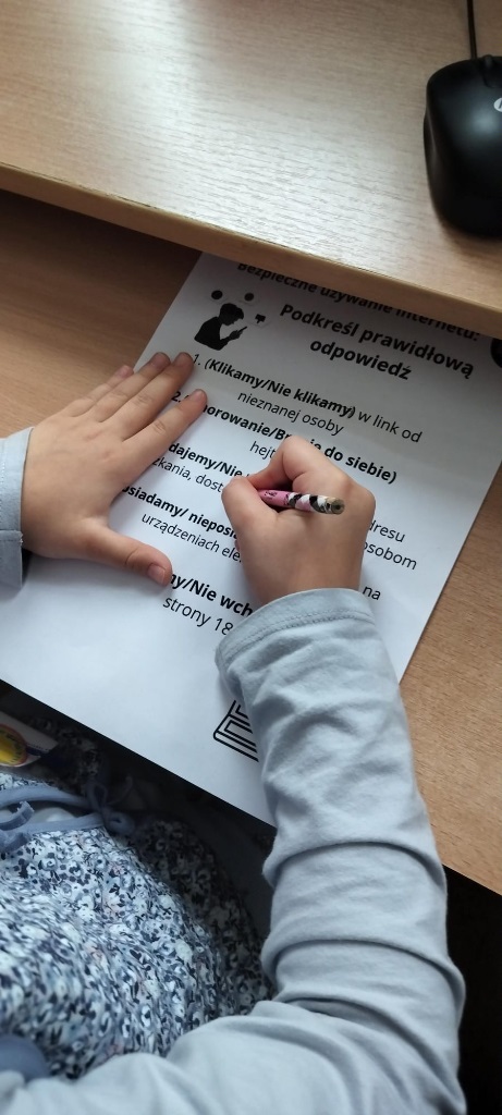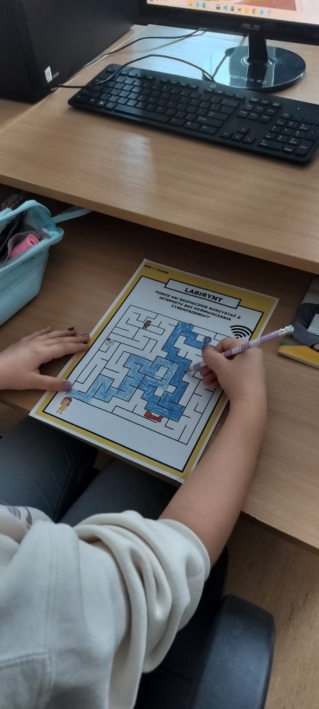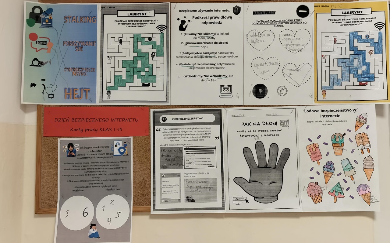 Uczniowie klas I–III wypełniali karty pracy dotyczące bezpiecznego korzystania z Internetu. Materiały te zostały przygotowane przez uczniów klasy 7a z wykorzystaniem aplikacji Canva. Przykładowe, uzupełnione karty pracy oraz gazetka informacyjna poświęcona bezpieczeństwu w sieci zostały zaprezentowane na tablicach informacyjnych na korytarzu I piętra.