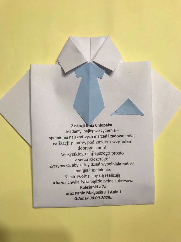 W klasie 7a Dzień Chłopaka trwał dwa dni. 30 września chłopcy otrzymali od dziewcząt słodycze i "koszulki" z życzeniami, a następnego dnia aktywnie spędzaliśmy czas w Movement Arena na lekcji WF-u. Po rozgrzewce uczniowie pod okiem trenerów wykonywali salta, ćwiczyli na poręczach, skakali na trampolinach, pokonywali tory przeszkód. Po zakończeniu zajęć uczniowie stwierdzili, że było fajnie, a wychowawczynie zadeklarowały, że wystąpią do nauczycielek wychowania fizycznego o 6 dla uczestników za aktywność i zaangażowanie.