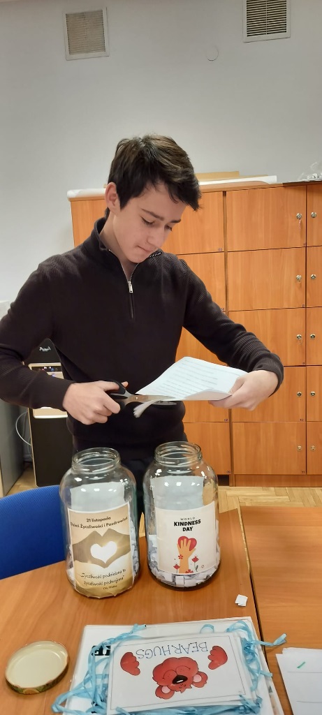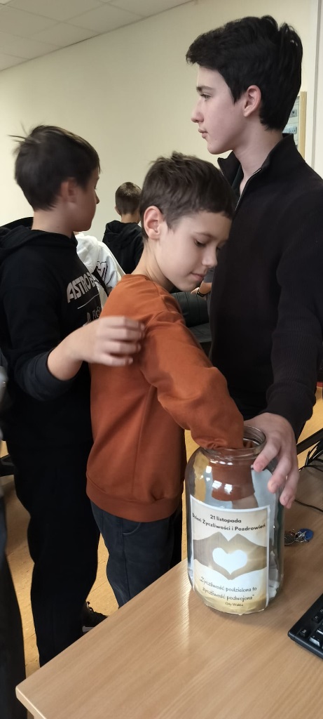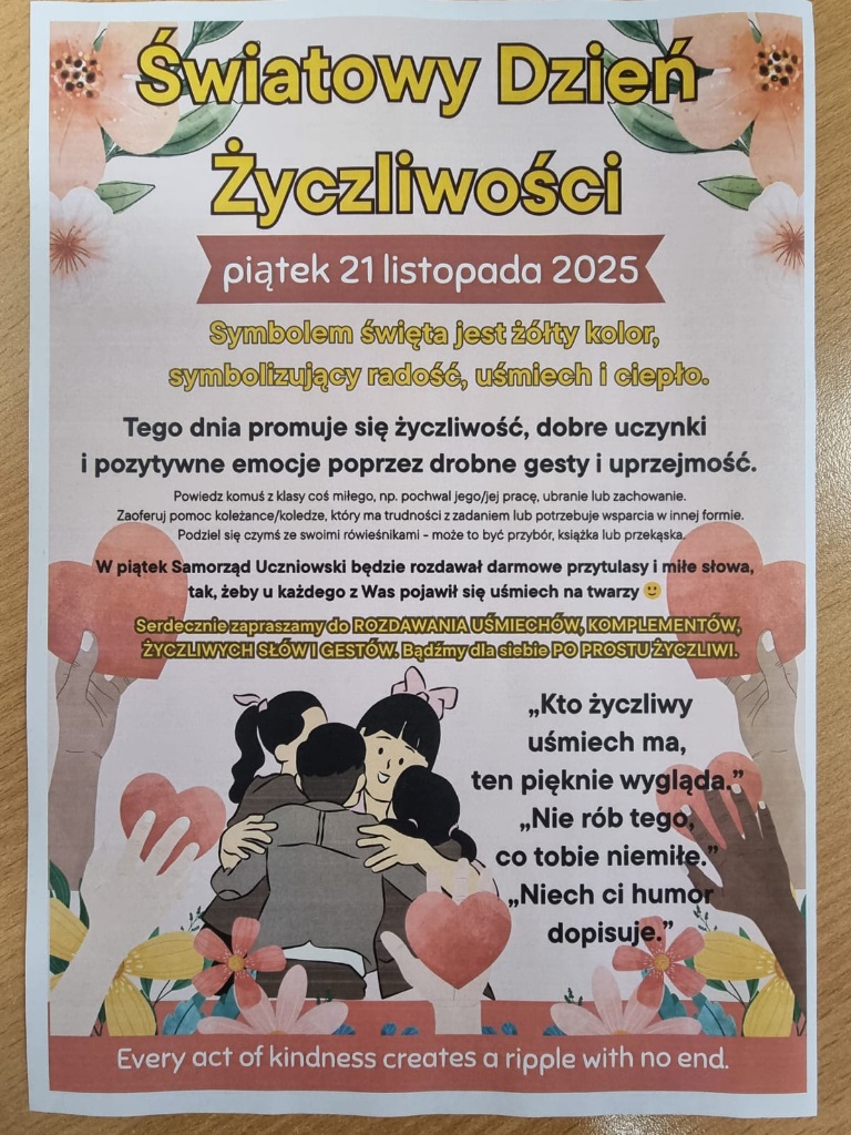 21 listopada przypada Dzień Życzliwości, Pozdrowień i Przytuleń. W tym dniu nauczyciele, uczniowie i obsługa szkoły mogli wylosować pozytywne zdania ze słoika życzliwości, który SU nosił po wszystkich klasach i korytarzach SP52. Na drzewie życzliwości można było przypiąć życzliwe słowa, jak również zerwać z ulotki miłe zdania i przekazać je innej osobie. A uczennice, które były ubrane w kigurumi, rozdawały darmowe uściski i przytulasy, aby na twarzach pojawiły się uśmiechy.