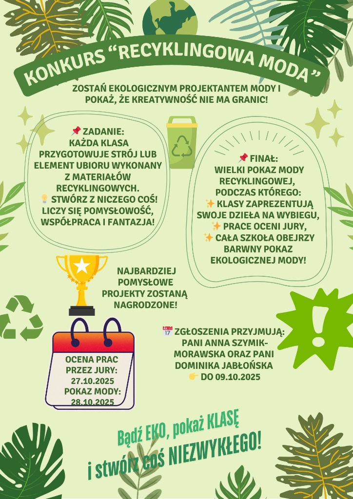 Serdecznie zapraszamy uczniów naszej szkoły do udziału w konkursie „Recyklingowa Moda”. Celem przedsięwzięcia jest rozwijanie kreatywności, umiejętności pracy zespołowej oraz promowanie postaw proekologicznych.