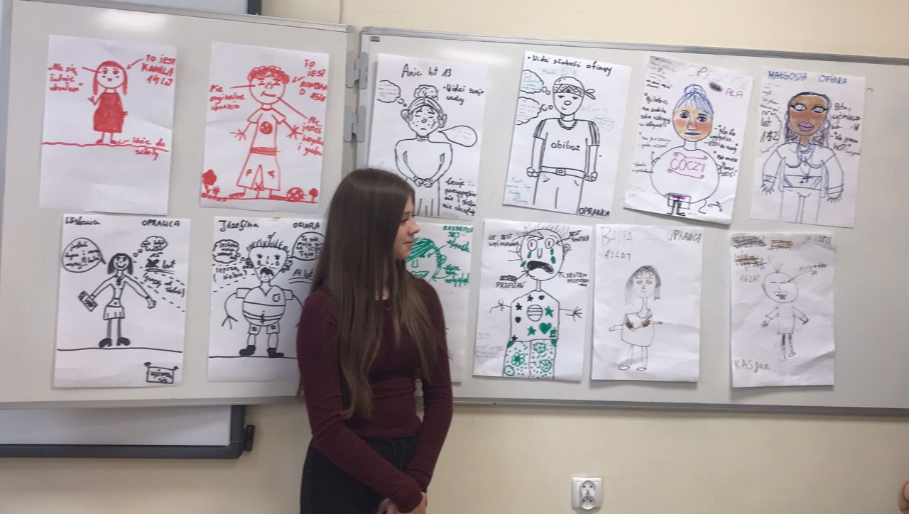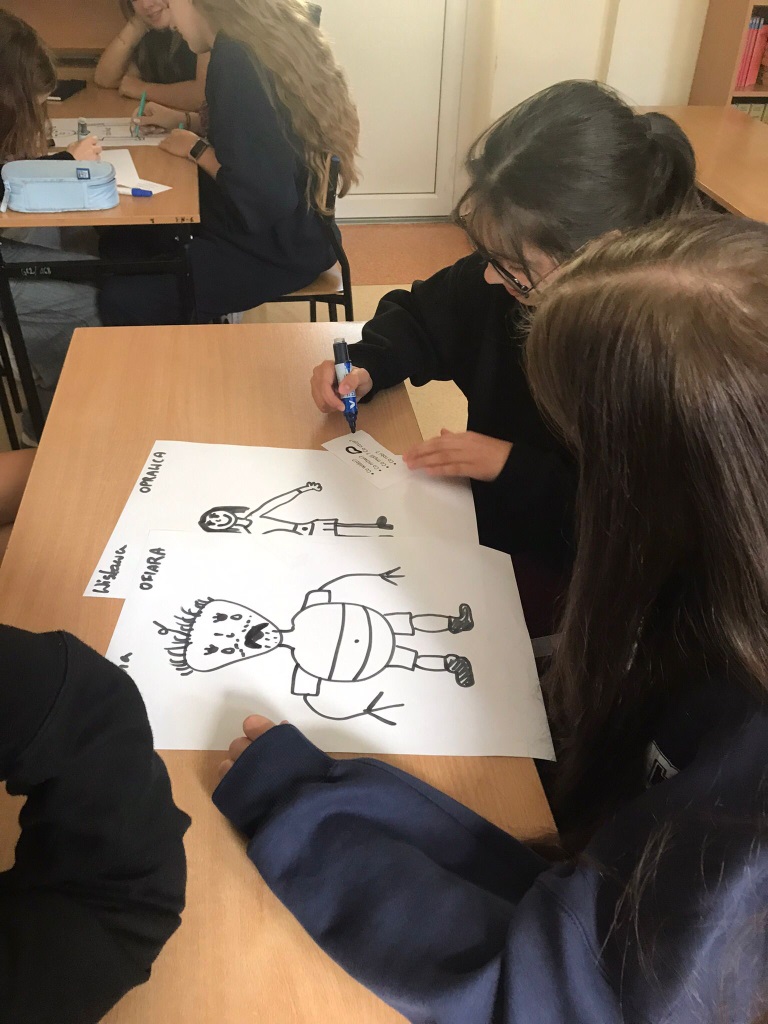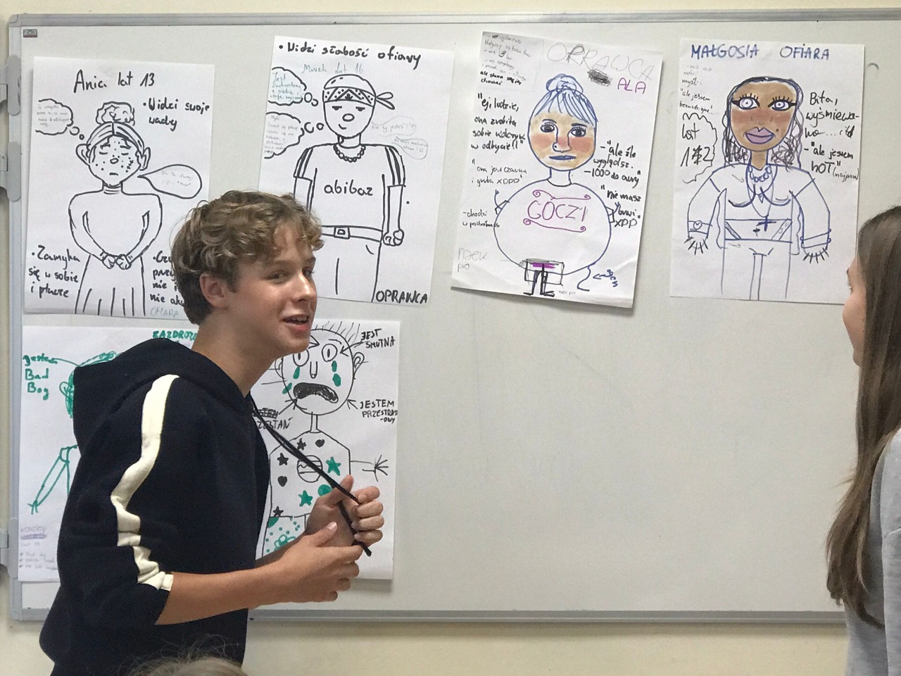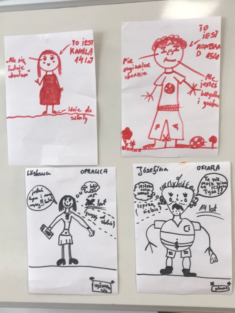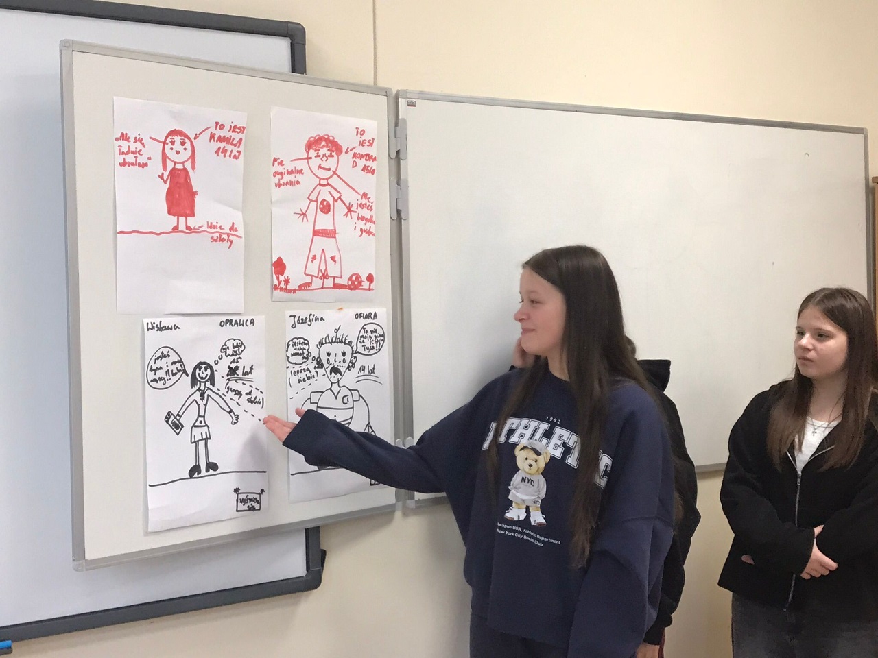 W trakcie zajęć uczniowie wspólnie zastanawiali się nad mechanizmami przemocy i jej skutkami. W ramach ćwiczeń tworzyli postacie – ofiary i oprawcy – analizując ich emocje, motywacje oraz działania. Dzięki temu mogli lepiej zrozumieć, jak różne są perspektywy i jak ważna jest empatia w codziennych relacjach międzyludzkich.