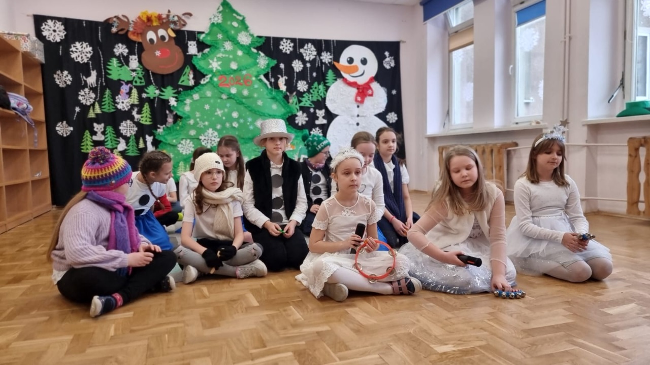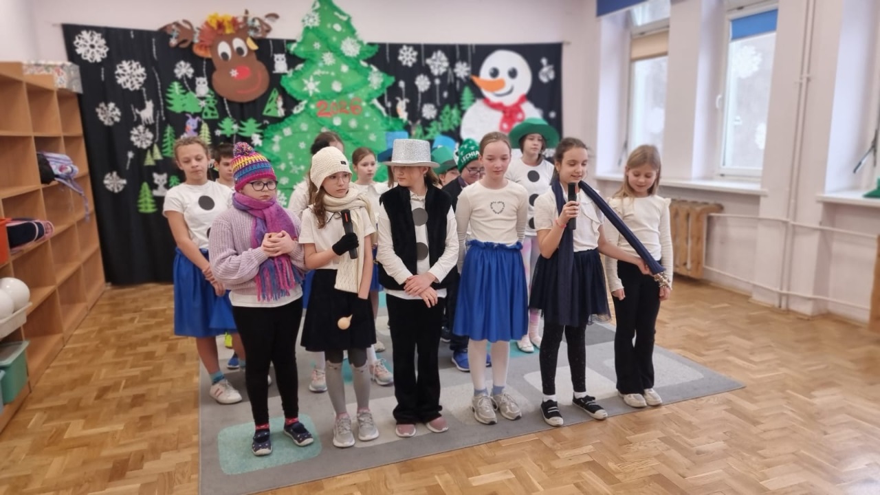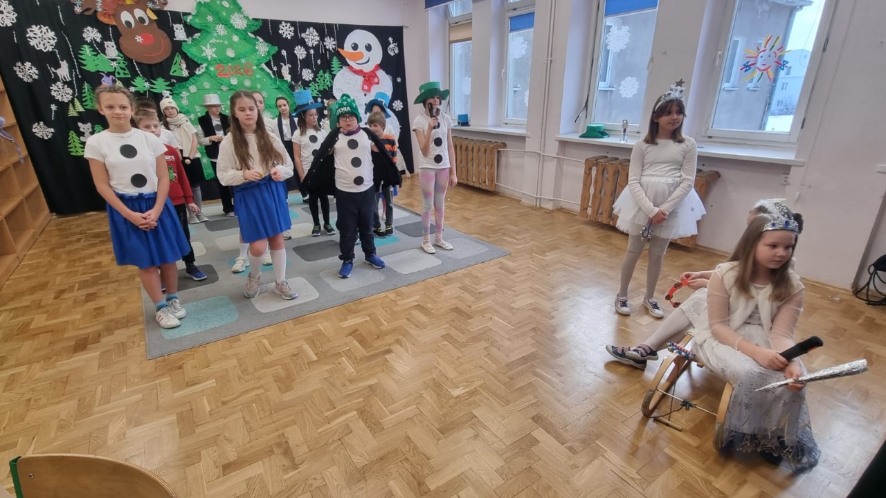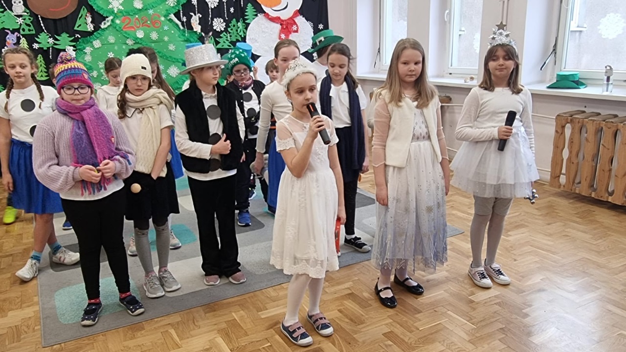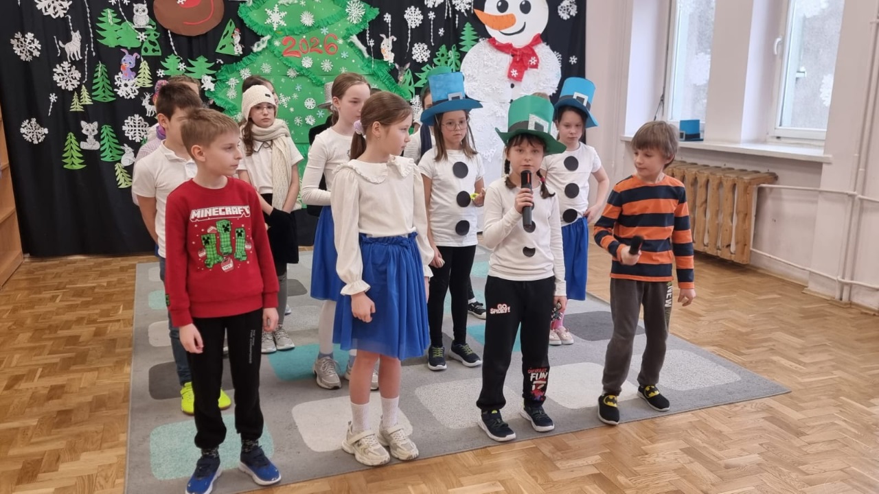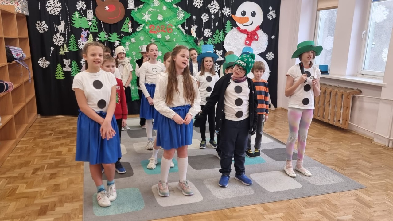 15 stycznia 2026 r. zaprosiliśmy do świetlicy szkolnej - pięknie udekorowanej na tę okazję - dzieci z klas I-III, wraz z nauczycielami i dyrekcją szkoły na przedstawienie przygotowane z dziećmi z klas trzecich pt. „Rady na bezpieczne ferie", okraszone piosenkami i tańcem. Dzieci dzieliły się swoimi pomysłami na zimowe zabawy, a bałwanki upominały je, by te zabawy były bezpieczne. Po przedstawieniu dzieci odpowiadały na pytania dotyczące bezpiecznych zabaw na śniegu i lodzie, oraz zasad bezpieczeństwa w kontakcie z obcymi. Spotkanie zakończyło się wspólnie zaśpiewaną piosenką „Sanna".