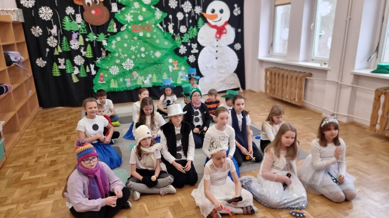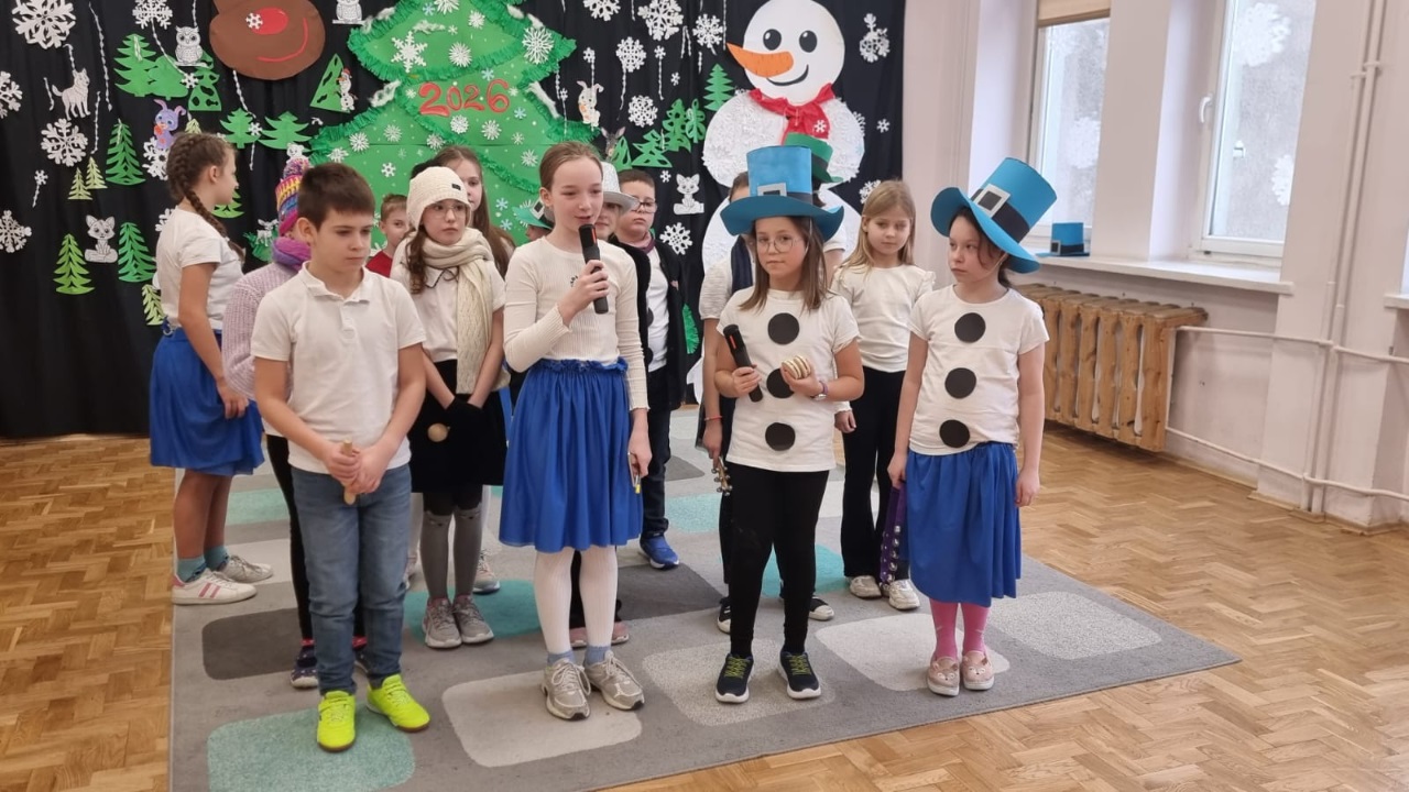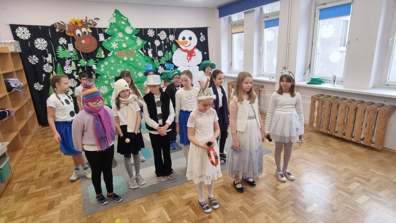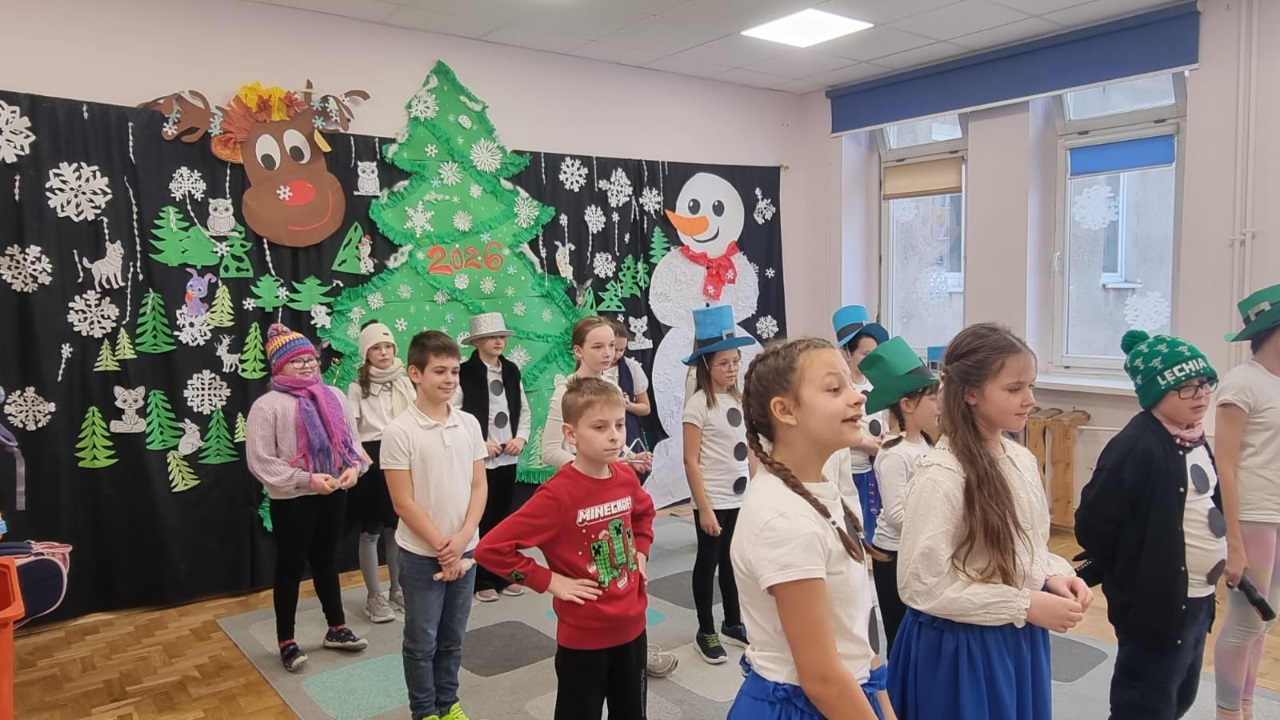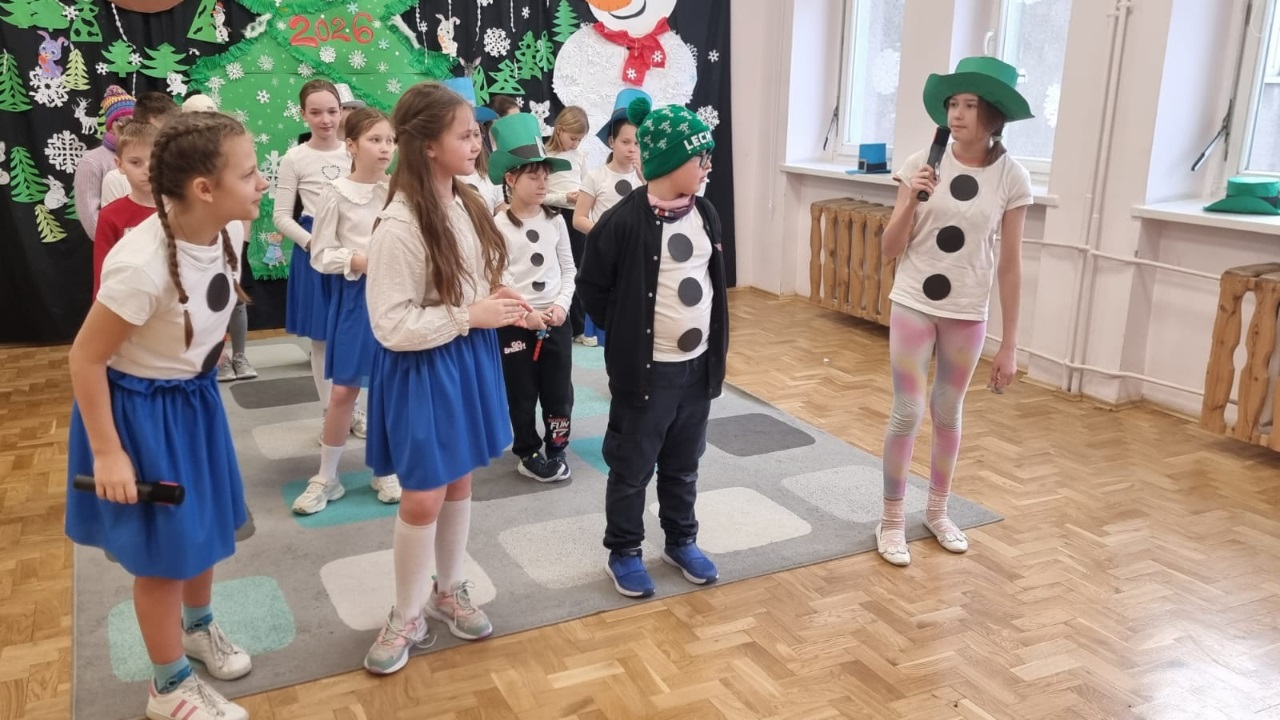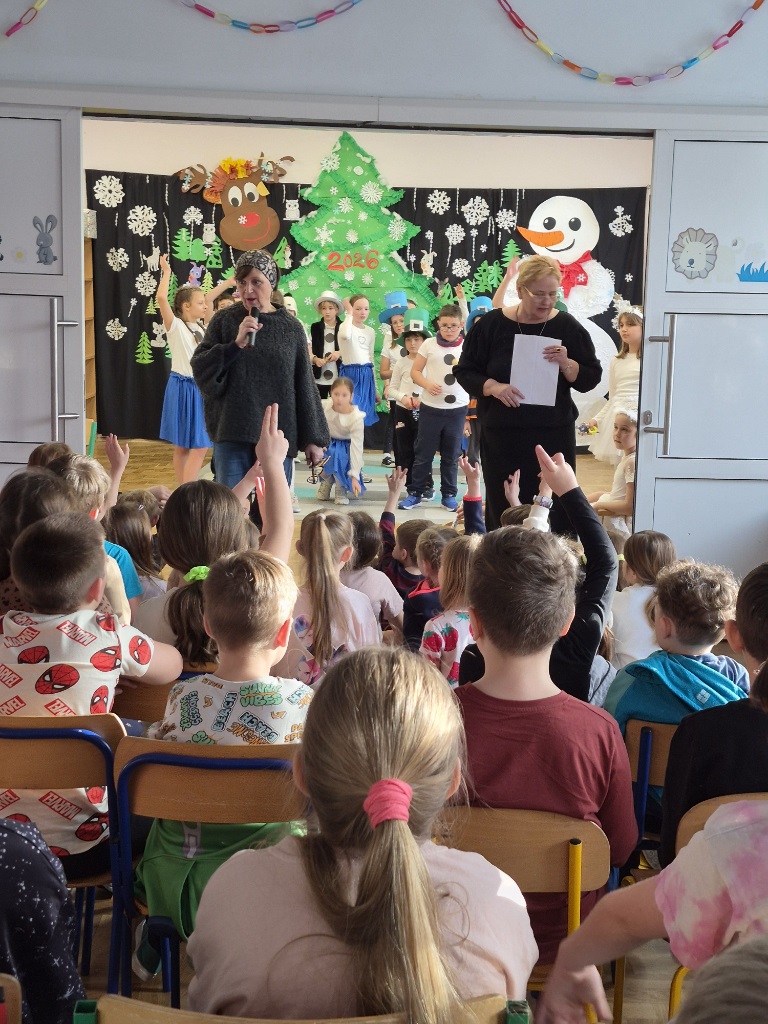 15 stycznia 2026 r. zaprosiliśmy do świetlicy szkolnej - pięknie udekorowanej na tę okazję - dzieci z klas I-III, wraz z nauczycielami i dyrekcją szkoły na przedstawienie przygotowane z dziećmi z klas trzecich pt. „Rady na bezpieczne ferie", okraszone piosenkami i tańcem. Dzieci dzieliły się swoimi pomysłami na zimowe zabawy, a bałwanki upominały je, by te zabawy były bezpieczne. Po przedstawieniu dzieci odpowiadały na pytania dotyczące bezpiecznych zabaw na śniegu i lodzie, oraz zasad bezpieczeństwa w kontakcie z obcymi. Spotkanie zakończyło się wspólnie zaśpiewaną piosenką „Sanna".