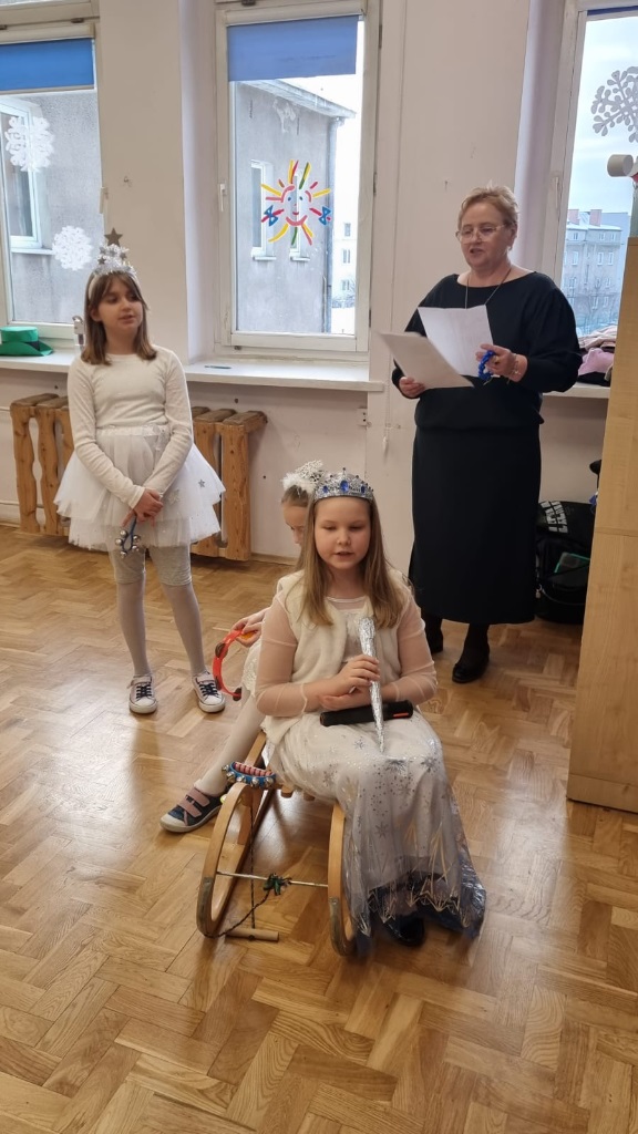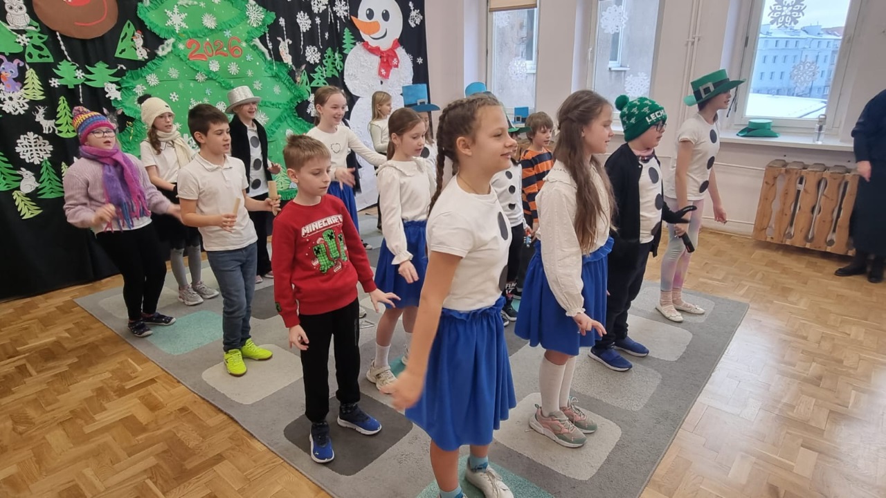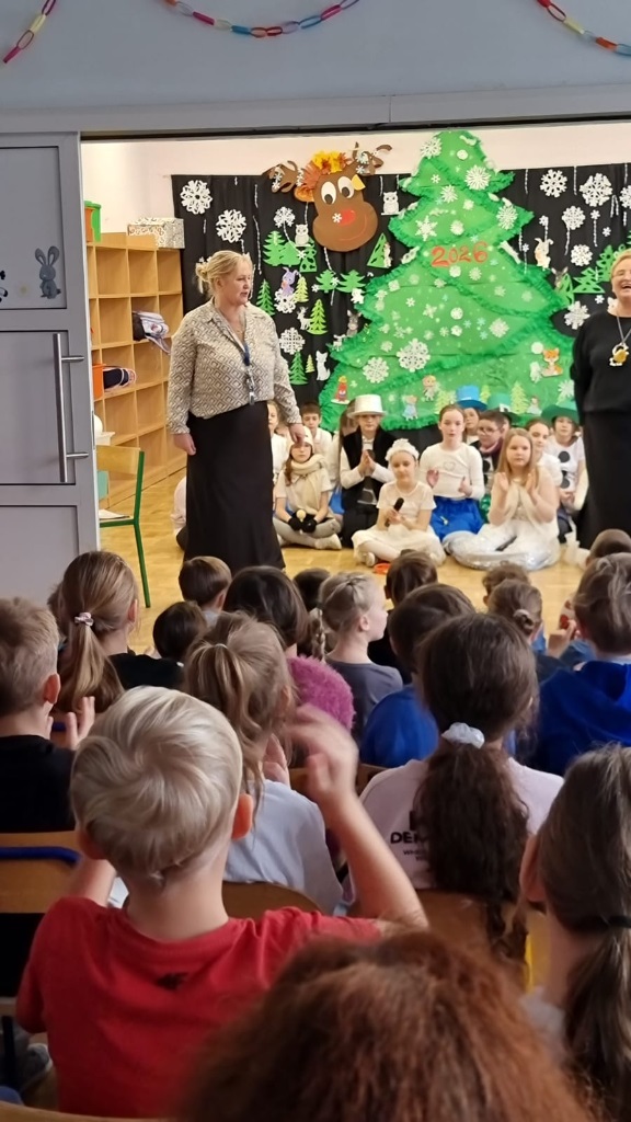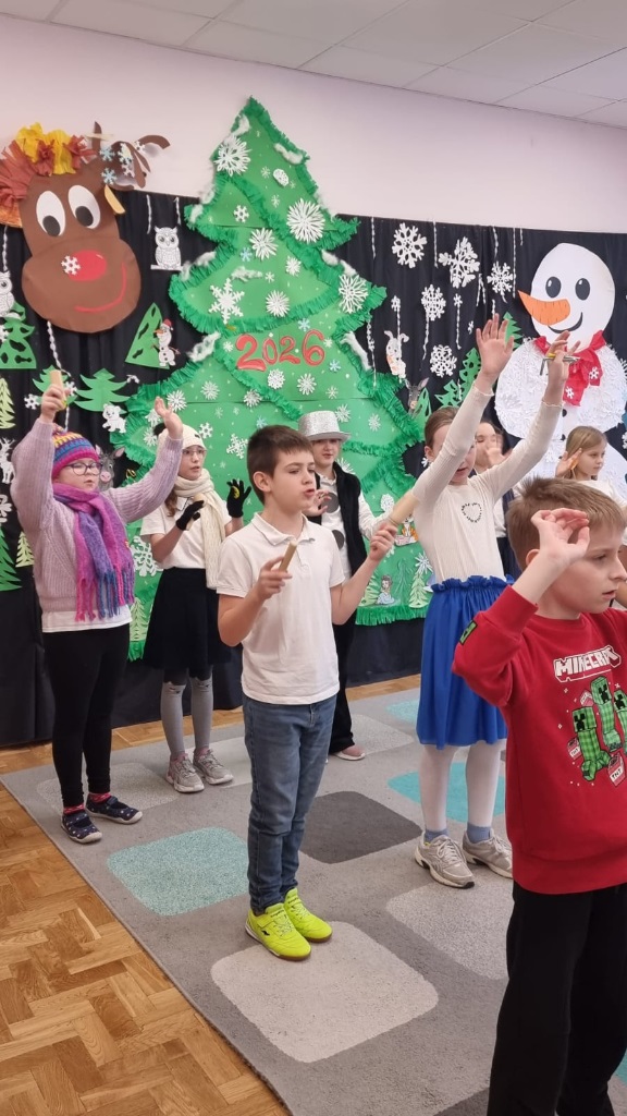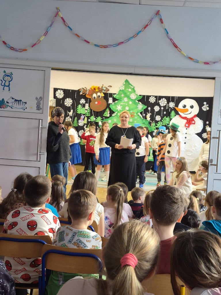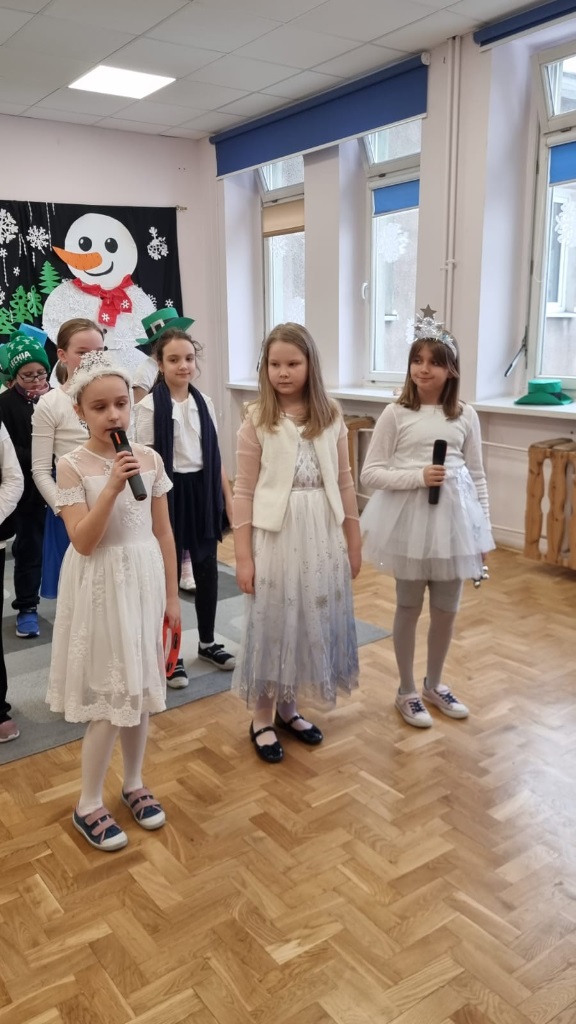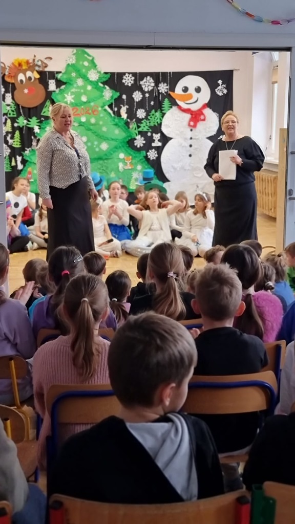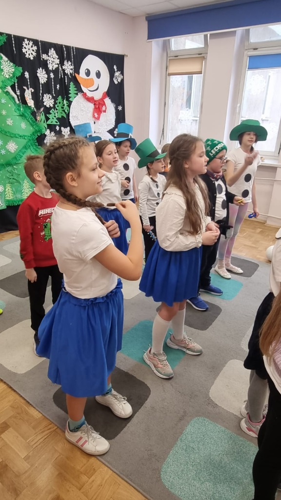 15 stycznia 2026 r. zaprosiliśmy do świetlicy szkolnej - pięknie udekorowanej na tę okazję - dzieci z klas I-III, wraz z nauczycielami i dyrekcją szkoły na przedstawienie przygotowane z dziećmi z klas trzecich pt. „Rady na bezpieczne ferie", okraszone piosenkami i tańcem. Dzieci dzieliły się swoimi pomysłami na zimowe zabawy, a bałwanki upominały je, by te zabawy były bezpieczne. Po przedstawieniu dzieci odpowiadały na pytania dotyczące bezpiecznych zabaw na śniegu i lodzie, oraz zasad bezpieczeństwa w kontakcie z obcymi. Spotkanie zakończyło się wspólnie zaśpiewaną piosenką „Sanna".