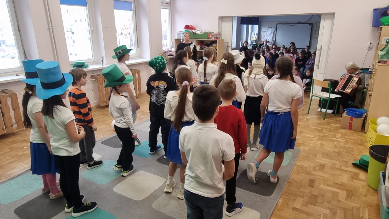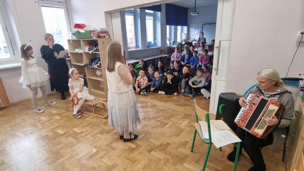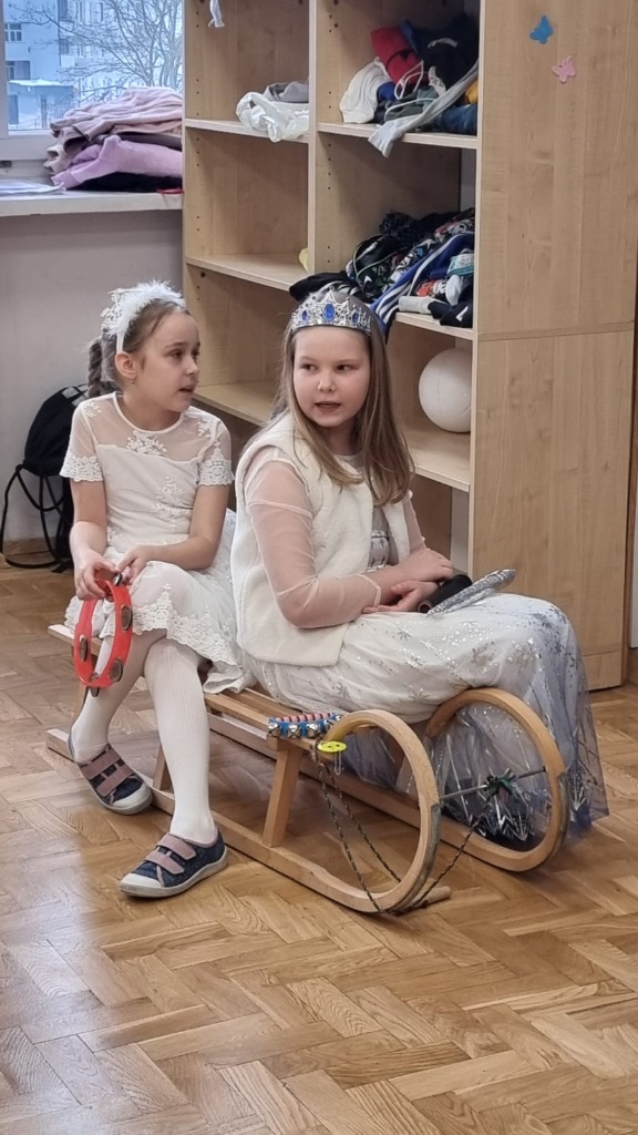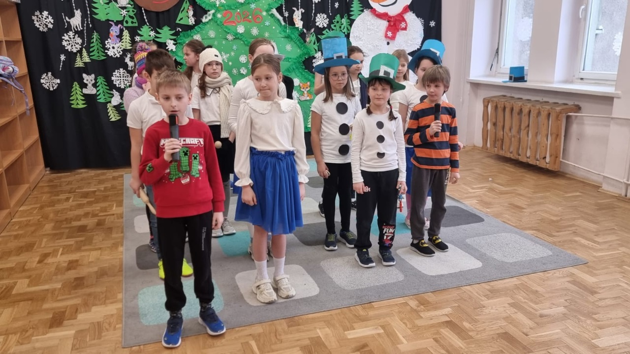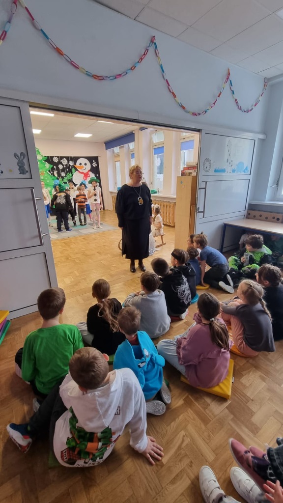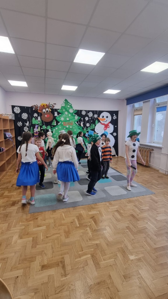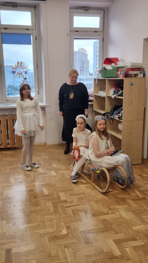 15 stycznia 2026 r. zaprosiliśmy do świetlicy szkolnej - pięknie udekorowanej na tę okazję - dzieci z klas I-III, wraz z nauczycielami i dyrekcją szkoły na przedstawienie przygotowane z dziećmi z klas trzecich pt. „Rady na bezpieczne ferie", okraszone piosenkami i tańcem. Dzieci dzieliły się swoimi pomysłami na zimowe zabawy, a bałwanki upominały je, by te zabawy były bezpieczne. Po przedstawieniu dzieci odpowiadały na pytania dotyczące bezpiecznych zabaw na śniegu i lodzie, oraz zasad bezpieczeństwa w kontakcie z obcymi. Spotkanie zakończyło się wspólnie zaśpiewaną piosenką „Sanna".