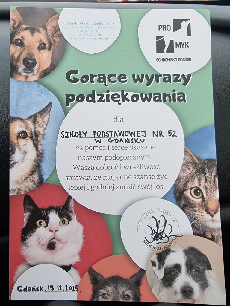 Samorząd Uczniowski wraz z Opiekunkami oraz p. Dorotą Szutą składa serdeczne podziękowania wszystkim Darczyńcom o wielkich sercach za okazane wsparcie i przekazane dary dla skrzywdzonych oraz bezdomnych zwierząt, które czekają na swój nowy dom w schronisku.