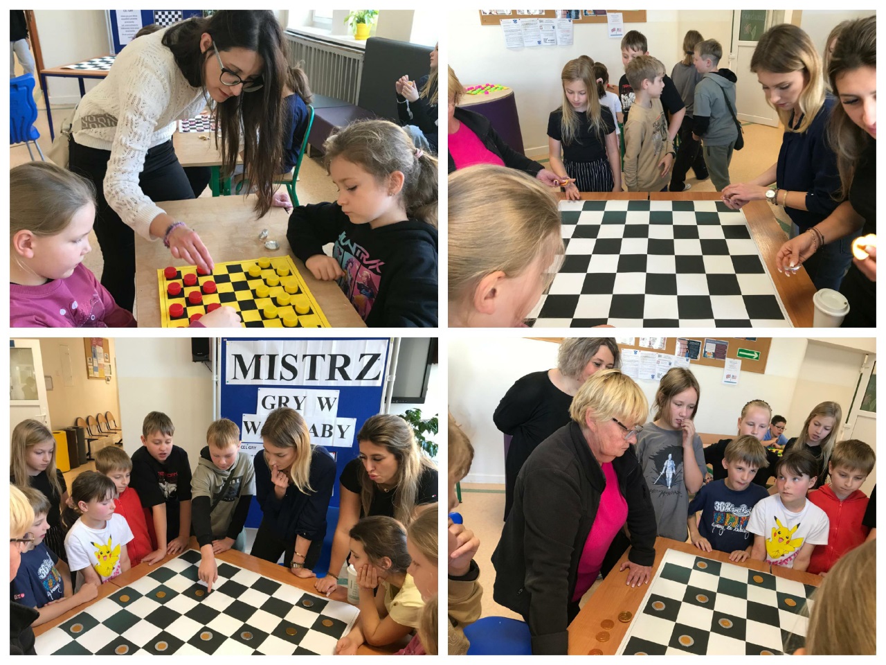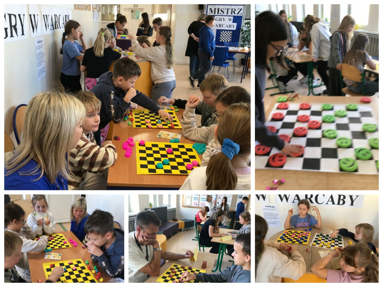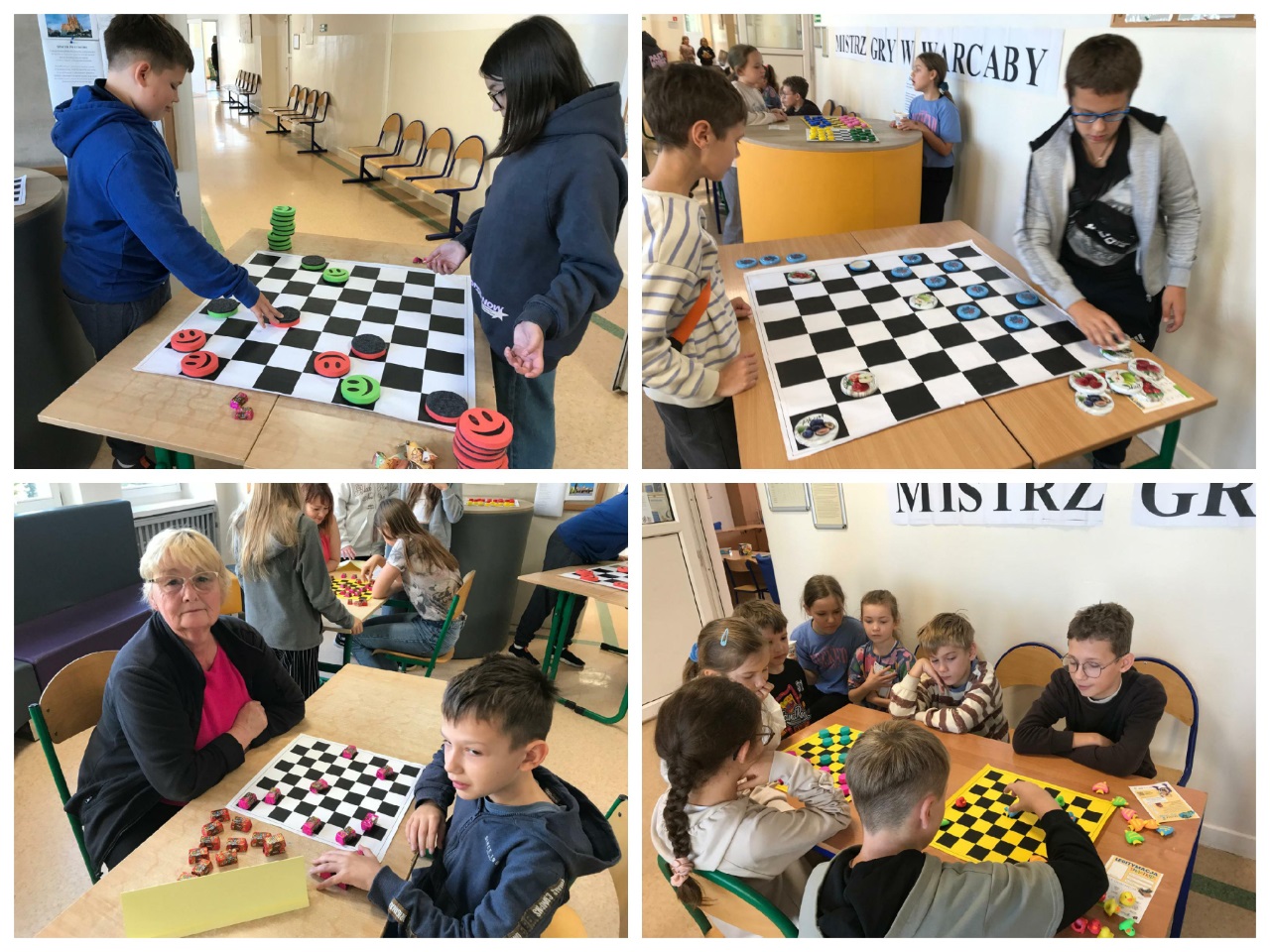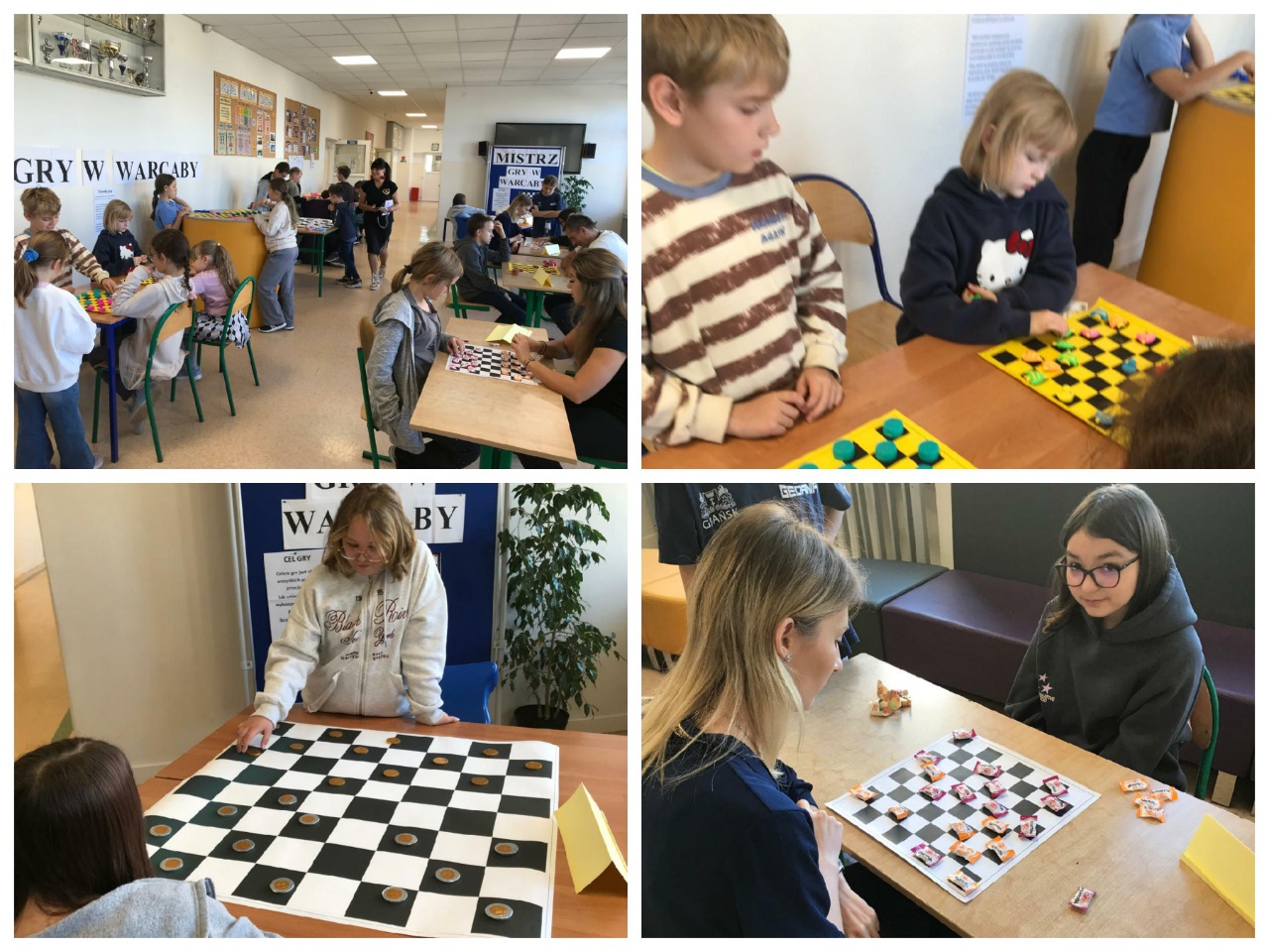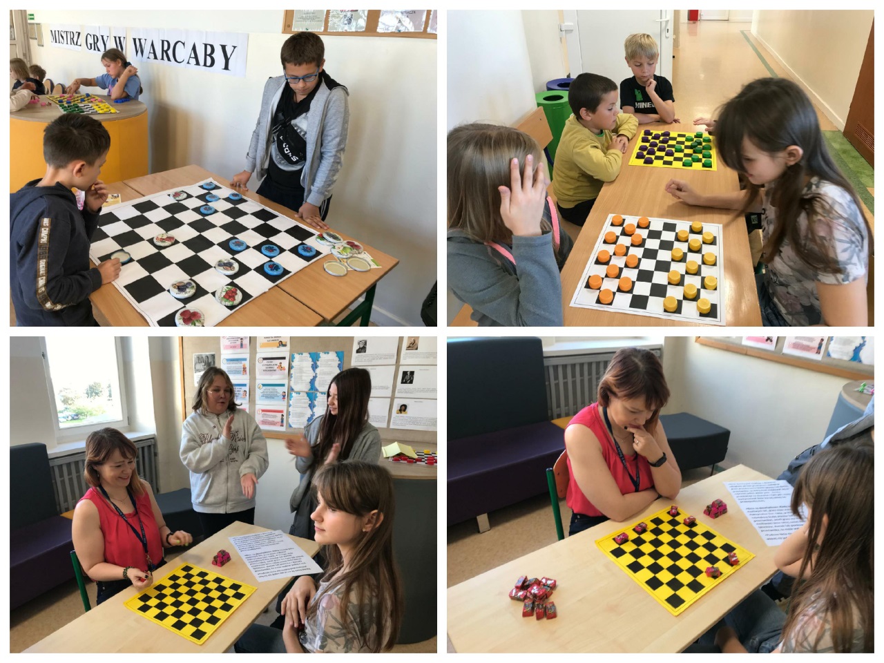 14 października zorganizowany został turniej "Mistrz Gry w Warcaby". Warcaby zawsze cieszyły się ogromnym powodzeniem wśród gier planszowych, ponieważ rozwijają umiejętność taktyki, przewidywania ruchów i ćwiczą koordynację. Tym razem zawodnikami byli uczniowie- Michał, Bianka, Julia i Michał z klas 6 oraz nauczyciele -Pani Violetta, Dorota, Klaudia i Pan Grzegorz – wzięli oni udział w rozgrywkach w dniu swojego święta. Turniej został rozegrany w czterech grupach, a głównymi pionkami były cukierki. Warto było więc o nie walczyć. Do półfinału zakwalifikowały się Panie Violetta i Dorota oraz Michał i Julia. Po rozegraniu partii, zwyciężyły Panie -Violetta i Dorota, i rywalizowały ze sobą o tytuł "Mistrza Gry w Warcaby". Walka trwała do samego końca. Ostatecznie "Mistrzynią Warcabów" została Pani Violetta, której serdecznie gratulujemy. Mistrzyni swoje zdobyte pionki -cukierki rozdała kibicom. Było słodko i wesoło. Kibice wtórując turniejowi rozgrywali też swoje partie z różnymi wynikami. Zobaczcie zresztą, jak to wyglądało w fotograficznym skrócie.