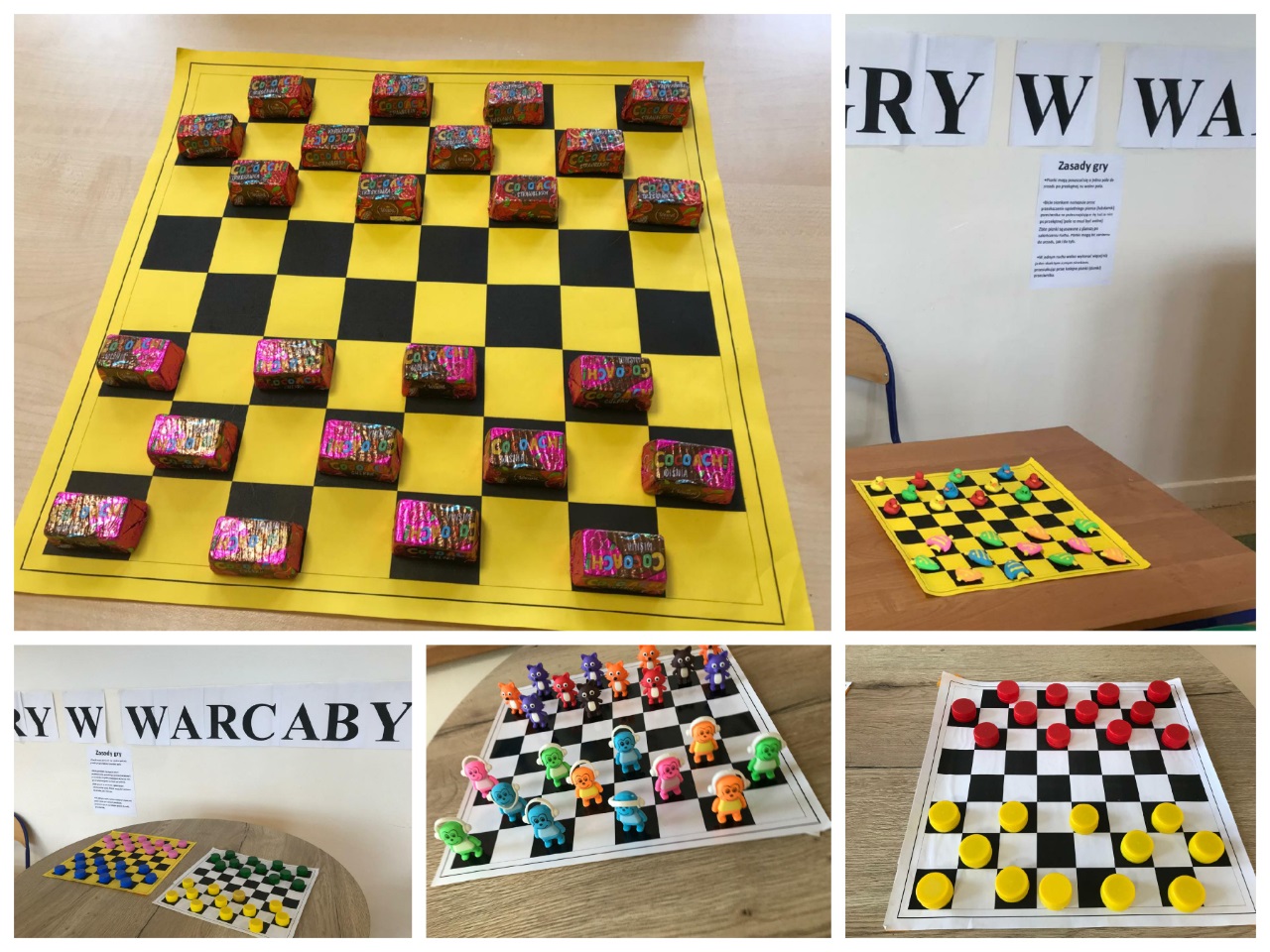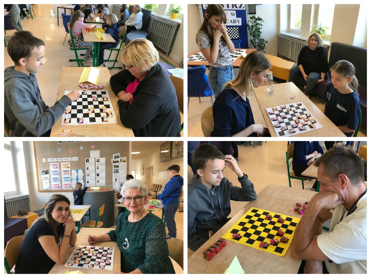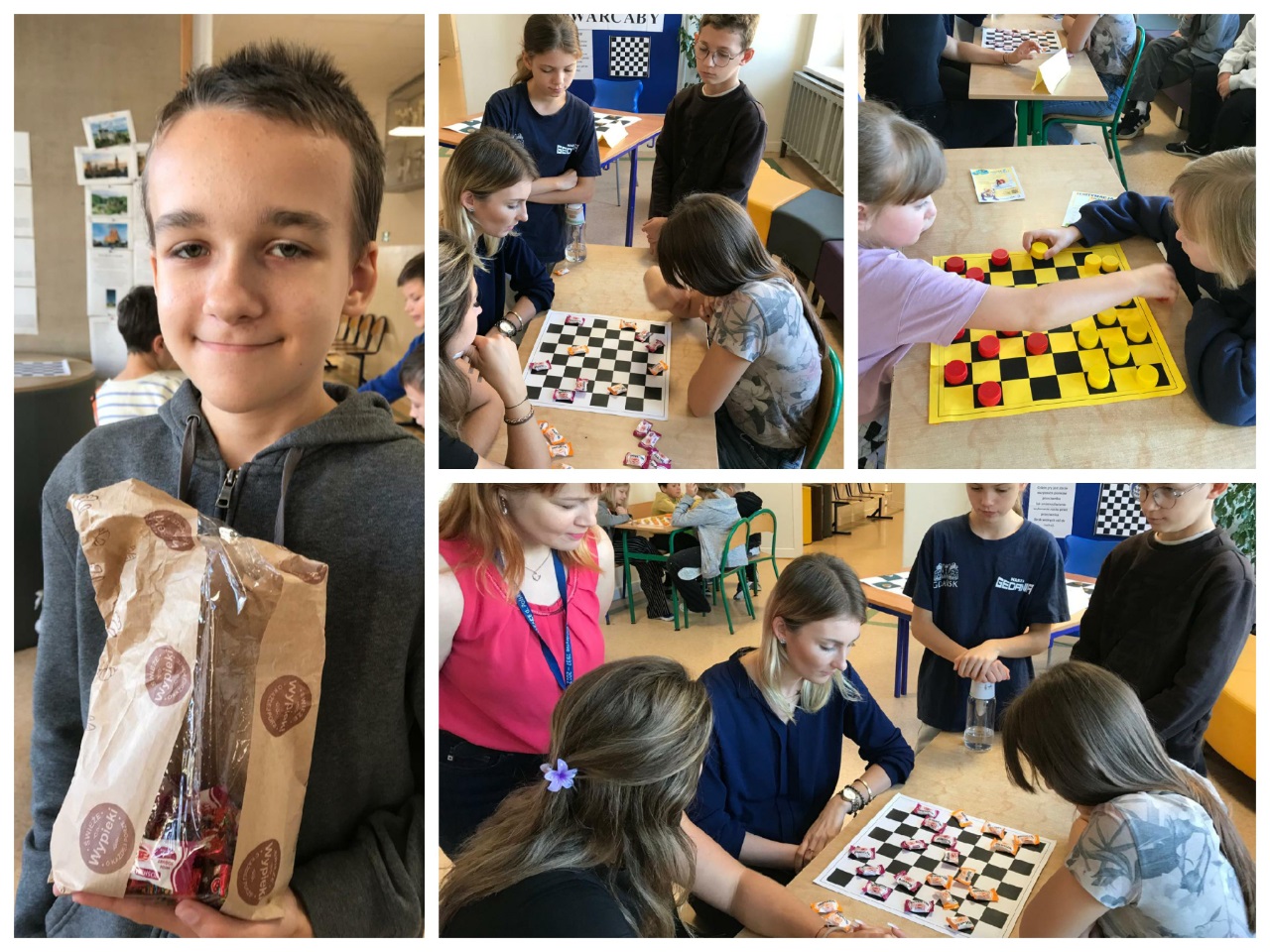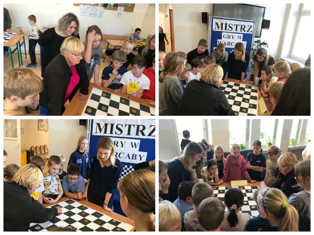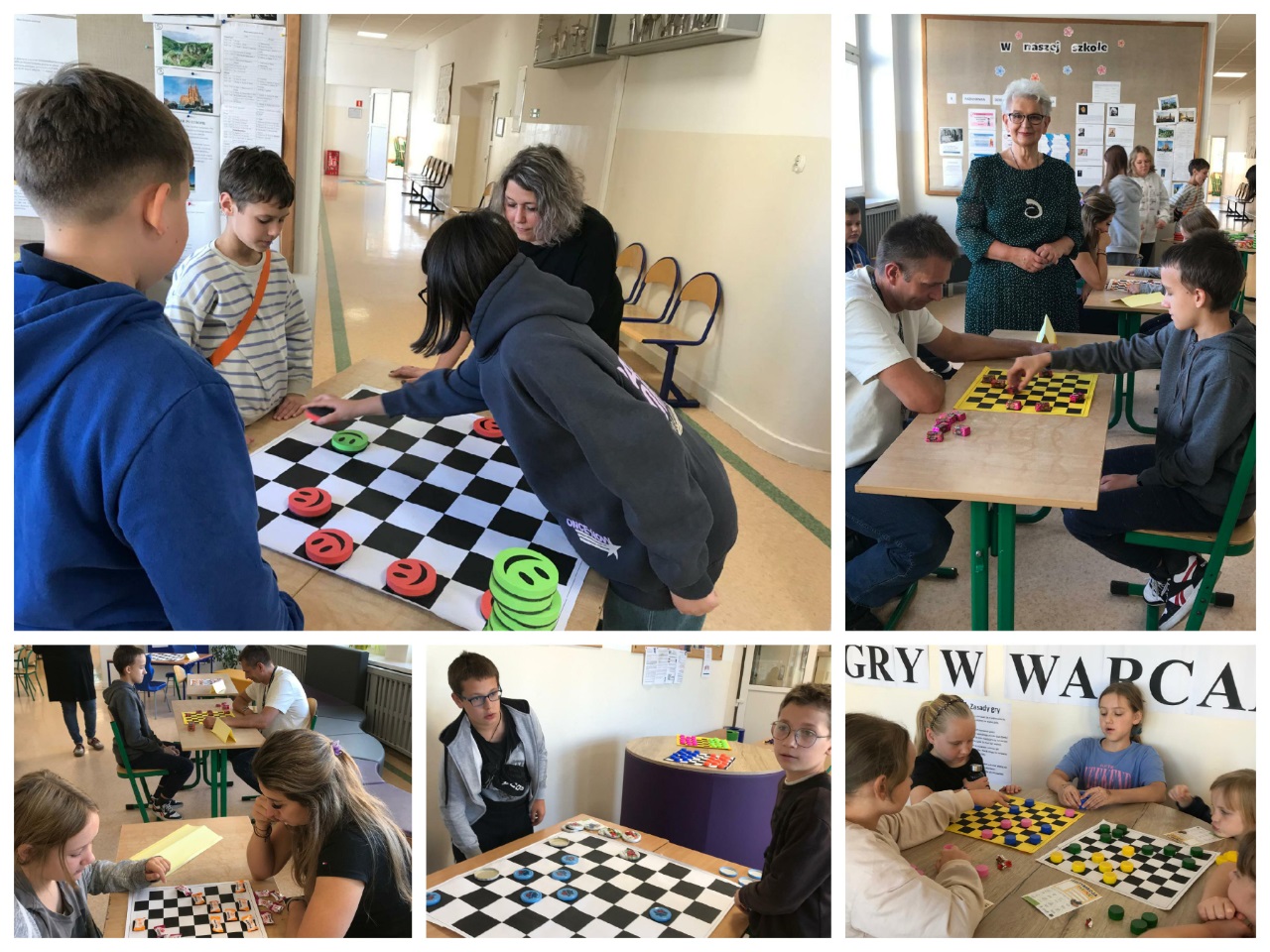 14 października zorganizowany został turniej "Mistrz Gry w Warcaby". Warcaby zawsze cieszyły się ogromnym powodzeniem wśród gier planszowych, ponieważ rozwijają umiejętność taktyki, przewidywania ruchów i ćwiczą koordynację. Tym razem zawodnikami byli uczniowie- Michał, Bianka, Julia i Michał z klas 6 oraz nauczyciele -Pani Violetta, Dorota, Klaudia i Pan Grzegorz – wzięli oni udział w rozgrywkach w dniu swojego święta. Turniej został rozegrany w czterech grupach, a głównymi pionkami były cukierki. Warto było więc o nie walczyć. Do półfinału zakwalifikowały się Panie Violetta i Dorota oraz Michał i Julia. Po rozegraniu partii, zwyciężyły Panie -Violetta i Dorota, i rywalizowały ze sobą o tytuł "Mistrza Gry w Warcaby". Walka trwała do samego końca. Ostatecznie "Mistrzynią Warcabów" została Pani Violetta, której serdecznie gratulujemy. Mistrzyni swoje zdobyte pionki -cukierki rozdała kibicom. Było słodko i wesoło. Kibice wtórując turniejowi rozgrywali też swoje partie z różnymi wynikami. Zobaczcie zresztą, jak to wyglądało w fotograficznym skrócie.