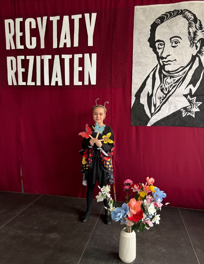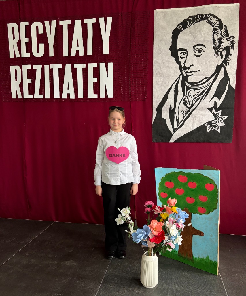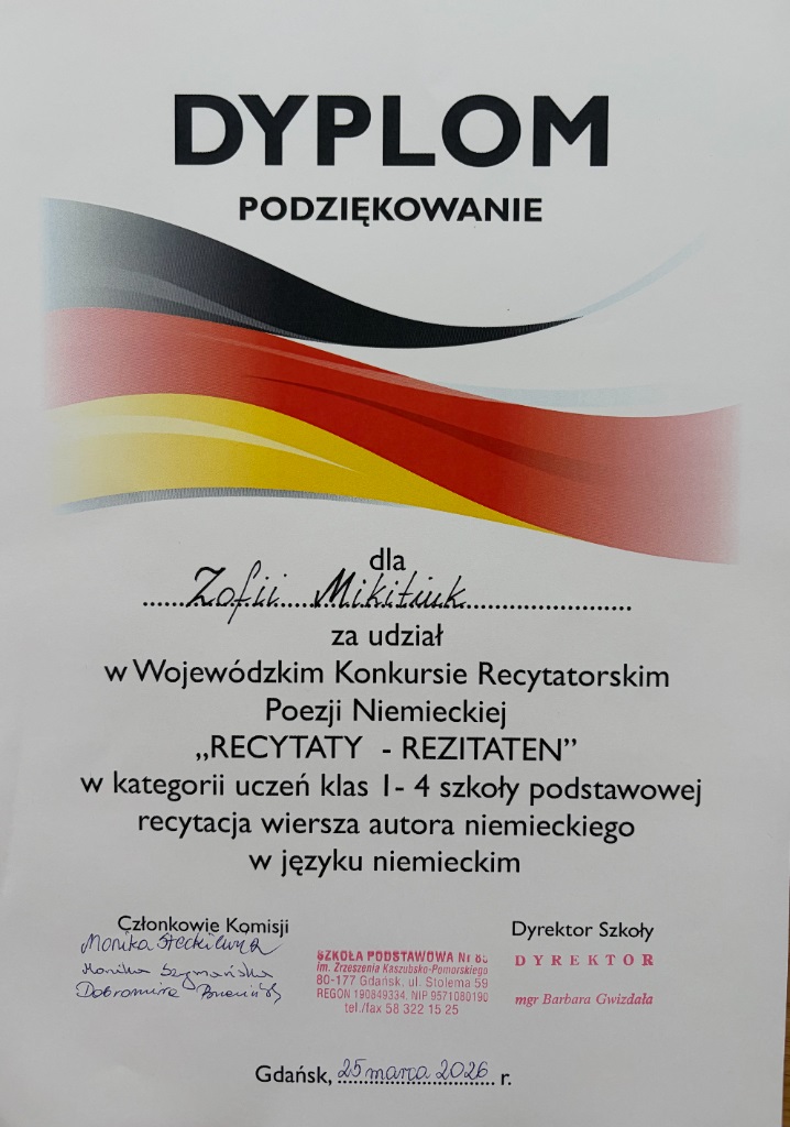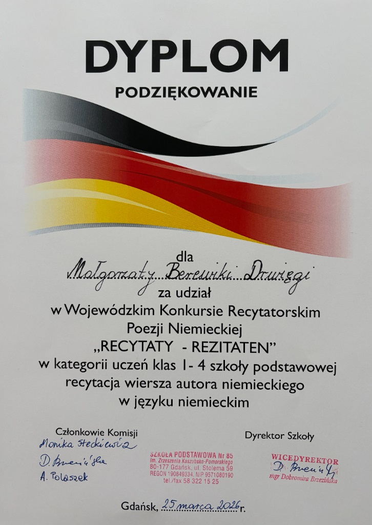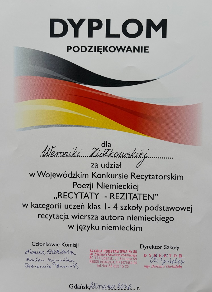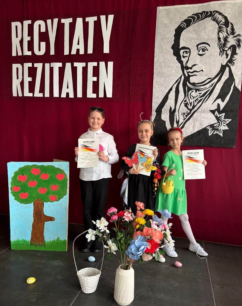 Uczennice naszej szkoły- Weronika Ziółkowska z 2a, Małgorzata Drwięga z 3a oraz Zofia Mikitiuk z 3b, brały udział w finale Wojewódzkiego Konkursu Poezji Niemieckiej "Recytaty - Rezitaten”, który odbył się w Szkole Podstawowej nr 85 w Gdańsku.