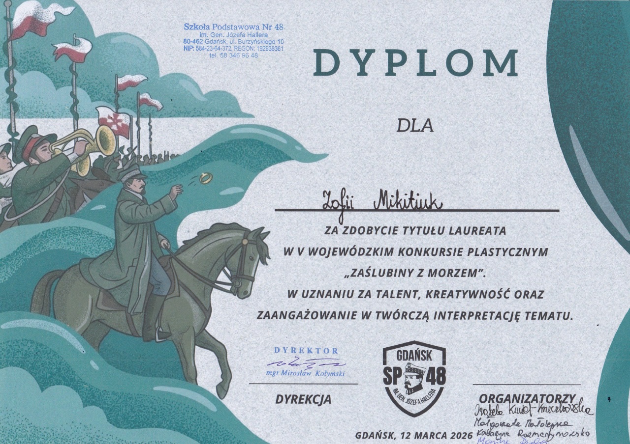 V Wojewódzki Konkurs Plastyczny „Zaślubiny z morzem” organizowany przez Szkołę Podstawową nr 48 w Gdańsku przyciągnął wielu utalentowanych twórców, którzy za pomocą pięknych prac przypomnieli o jednym z ważniejszych wydarzeń II Rzeczypospolitej. Jury miało niezwykle trudne zadanie, ale po długich obradach udało się wyłonić zwycięzców. Wśród laureatów nie zabrakło Zofii Mikitiuk z klasy III b.
