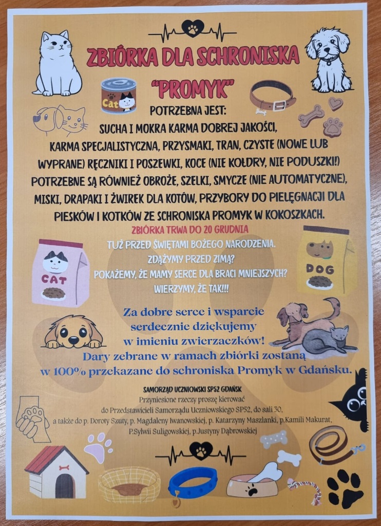 Zbiórka dla Schroniska dla zwierząt Promyk - Szkoła Podstawowa nr 52 im. Tadeusza Kościuszki